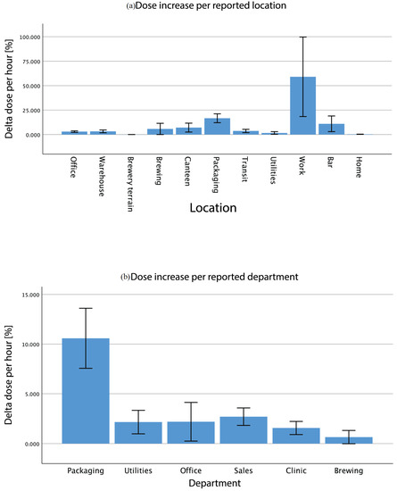 Average dose increase per hour per reported location (a) and per reported department (b); error bars represent 95% confidence intervals.