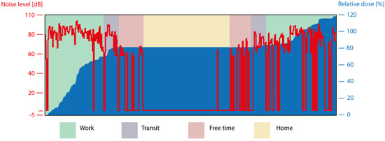 Typical personal noise dosimetry (PND) recording with logbook overlay: Graphical visualization of a 24-h run of a PND. The red line (left axis) is the variation of the recorded noise level over time (horizontal axis 0 to 24 h). Levels below 70 dB were not recorded and showed as drops in the recording. Blue graph (right axis) shows the cumulative dose over time. Colored areas in the background represent the whereabouts of the subject as reported in his/her logbook.