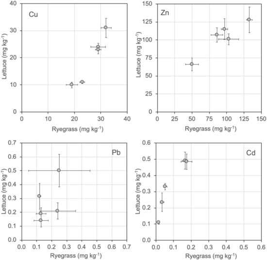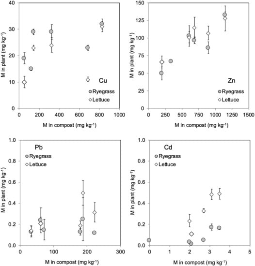Table 3 and Figure 1 show the concentrations of Cu, Pb, Zn and Cd in lettuce and ryegrass tissue. Whereas Cu, Pb and Zn were present in very similar concentrations in ryegrass and lettuce, transference of Cd was higher to lettuce than to ryegrass. In both species, metal concentrations followed the sequence Zn > Cu >> Pb ≥ Cd, which is the same sequence for metal concentrations in four out of the five composts, and is the sequence commonly observed for metals in plant tissue of different species grown in non-contaminated soils [35], or in organic substrates with compost [36,37,38,39,40]. Concentrations for Cu and Zn are higher than the typical metal contents in plants grown in non-contaminated soils, but overall comparable to values found in plants grown in urban waste-composts [36,37,39]. Cadmium and Pb contents were very low and did not surpass the thresholds established in the EU regulations for leafy vegetables: 0.3 mg kg−1 (wet weight) for Pb and 0.20 mg kg−1 (wet weight) for Cd [41].