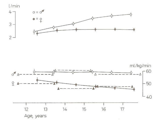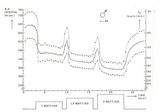 1.1. Heart Rate during Bicycle Ergometer Exercise in Watts/Kg Bodyweight in 12- and 13-Year-Old Boys