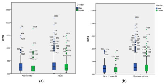 (a) Boxplot of BrAC by chronological age (adolescents and young adults) and gender (male and female); (b) boxplot of BrAC by age limit for alcohol drinking in Spain (up to 17 years old and 18 or more years old) and gender (male and female).