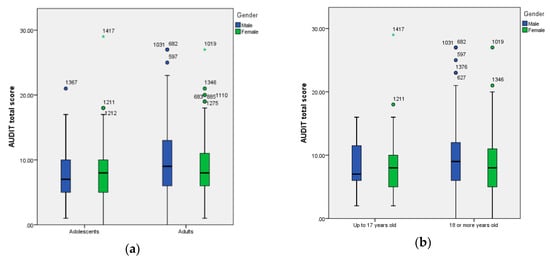 (a) Boxplot of AUDIT total scores by age (adolescents and young adults) and gender (male, female); (b) boxplot of AUDIT total scores by age limit for alcohol drinking in Spain (up to 17 years old and 18 or more years old) and gender (male and female).