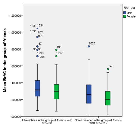 In order to assess the influence of contextual factors on alcohol use, we also collected objective and self-reported information on the group of friends. The comparison of BrAC means in groups formed by all members with a BrAC > 0 and groups with sober components indicated that BrAC scores decrease when some friends in the group are sober. Hypothesis testing showed that the mean difference remained statistically significant (see Table 7). In order not to underestimate the average value of BrAC in the group of friends, we eliminated the values for sober people. So, average BrAC in the group represents the value of BrAC only for those who had BrAC > 0.