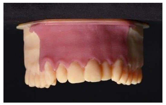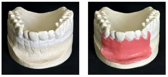 The gingival mask on the 3D-printed model was manufactured using a matrix technique. The 3D model of the matrix was designed using the 3D models of the maxilla plaster cast, with and without wax layer. For the fabrication of the gingival mask, silicone (GI-MASK, Coltene®, Liechtenstein) was injected into the recess of the matrix and pressed against the 3D-printed training model (Figure 5).
