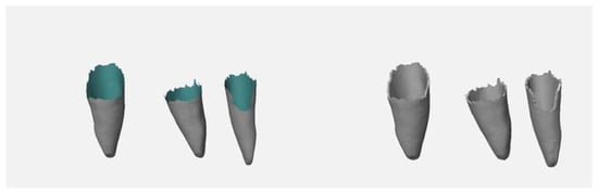 The upper parts of the teeth’s meshes (crown, upper part of the tooth root) were deleted. The remaining parts were thickened by 0.25 mm in Geomagic Wrap (3D Systems, Rock Hill, SC, USA) to create a model of the periodontal ligament (Figure 3), which is missing in the typodont model.