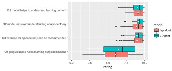 Prior to the study, the sample size was calculated to be 29 participants per group, whereby a difference of 0.5 points was considered statistically significant. The sample size calculation and statistical set-up was done by Dr. Raphael Koch (Institute of Biostatistics and Clinical Research, University of Münster). Statistical analysis was done by D.D. The primary endpoint was the comparison of the overall assessment of the models (apicoectomy on 3D-printed model vs. apicoectomy on typodont). The gingiva mask and its suitability for learning surgical incision also had to be evaluated. Additionally, it had to be assessed whether the surgical principles were understood with the help of the models and whether the exercise was recommendable. Due to the exam nature of the exercise, students did not have the opportunity to make a direct comparison between the two models. Since it was known that the exercise was well received in its previous form, the hypotheses to be tested were formulated conservatively, i.e., it was tested whether the printed models were not inferior to the conventional ones.