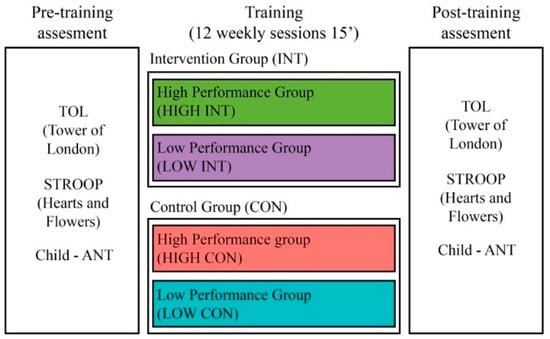 We implemented a quasi-experimental longitudinal controlled and randomized design, classified as an efficacy study [50] (Figure 1). Children were distributed into intervention (INT) and control (CON) groups and classified as high- and low-performing groups based on the children’s baseline performance in three tasks, i.e., inhibitory control, working memory, and planning. Differential training menus were designed for each group. Training consisted of a total of 12 sessions in which children performed 3 different activities (4 sessions for each one). After training implementation, the same cognitive tasks used in the pre-training stage was administered to each group.
