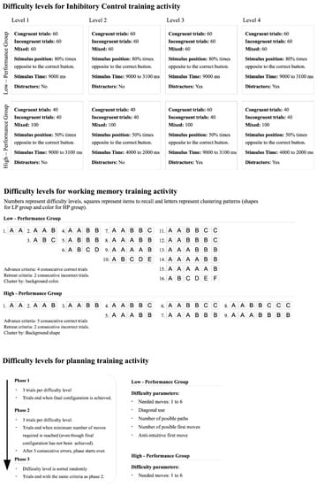 - Goldin, A.P.; Segretin, M.S.; Hermida, M.J.; Paz, L.; Lipina, S.J.; Sigman, M. Training Planning and Working Memory in Third Graders. Mind Brain Educ. 2013, 7, 136–146. [Google Scholar] [CrossRef]