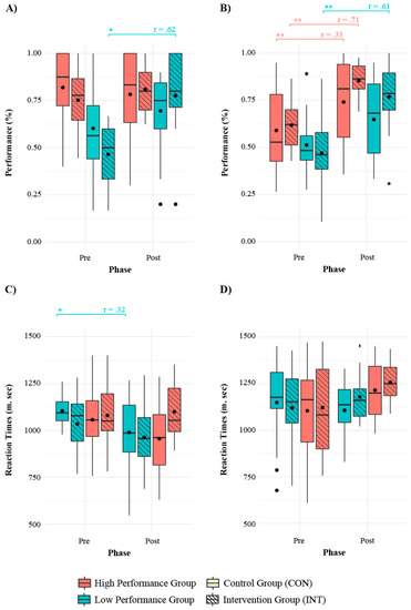 According to the Wilcoxon signed-rank test, differences were found within groups along the assessment phases. The number of omitted trials decreased for the LPG CON in the overall task (p = 0.02; r = 0.47) and also in the incongruent trials (p = 0.007; effect Size = −0.49), for the LPG INT in the incongruent trials (p = 0.04; r = −0.42), and for the HPG CON in the overall task (p < 0.005; r = 0.47), congruent (p = 0.02; r = 0.46), and incongruent trials (p = 0.002; r = 0.41). The number of omitted trials decreased for the HPG INT group, but did not show statistical significance. Performance increased for the LPG CON in the congruent trials (p = 0.04; r = 0.38) and for the LPG INT in the overall task (p = 0.003; r = 0.65) and in congruent (p = 0.008; r = 0.56) and incongruent trials (p = 0.006; r = 0.61), for the HPG CON in the overall task (p = 0.02; r = 0.36) and in congruent (p = 0.004; r = 0.34) and incongruent trials (p = 0.003; r = 0.33), and for the HPG INT in the overall task (p = 0.001; r = 0.67) and in the incongruent trials (p < 0.001; r = 0.71). RT diminished for the LPG INT in the congruent trials (p = 0.007; r = 0.46) and for the HPG CON in the whole task (p = 0.04; r = 0.28) and particularly in the congruent trials (p = 0.009; r = 0.42). Descriptive statistics also showed a decrease in RT in the incongruent trials for both low-performing groups, especially for LPG INT. The efficacy in executive network increased for all four performance groups, showing statistical differences for the LPG CON (p = 0.007; r = 0.43), LPG INT (p = 0.001; r = 0.67), and HPG CON (p = 0.03; r = 0.27). The alert network score diminished for the HPG CON (p < 0.05; r = 0.33).