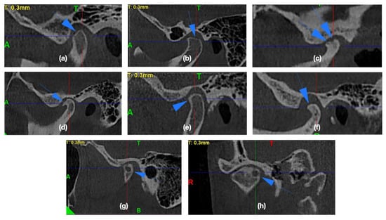 The exemplary osteoarthritic changes found in the temporomandibular joints (TMJ) cone beam computed tomography (CBCT) scans: (a,b) Articular surface flattening; (c) Erosion; (d) Osteophyte; (e) Subcortical sclerosis; (f) Generalized sclerosis; (g,h) Subcortical cyst.