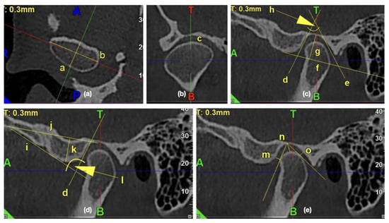 The exemplary lines, points, and angles in the temporomandibular joints (TMJ) cone beam computed tomography (CBCT) scans used for measurements. (a) Morphology of mandibular condyle in the axial view: /a/condylar A-P dimension, /b/condylar width; (b) Shape of condyle head in the coronal view: /c/condyle’s superior surface view assessment; (c) Morphology of glenoid fossa in the sagittal view: /d/PE line, /e/AT line, /f/glenoid fossa basal line, /g/glenoid fossa depth, /h/glenoid fossa divergence angle; (d) Morphology of articular eminence in the sagittal view: /i/AE line, /j/eminence basal line, /k/articular eminence height, /l/articular eminence divergence angle; (e) Assessment of anterior, posterior, and superior joint spaces in the sagittal view: /m/anterior joint space, /n/superior joint space, /o/posterior joint space.