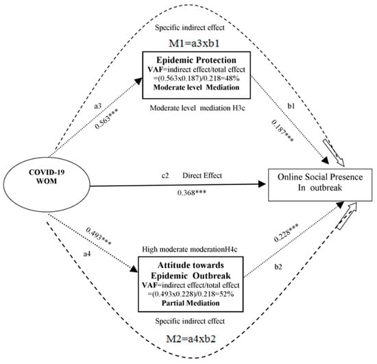 On social media, the importance of being online, especially during an epidemic outbreak, and the role of E-Govt in the quarantine period shown in previous research, urged us to explore this phenomenon on a broader basis. Positive awareness through the effects of COVID-19 word of mouth (2019-nCoV-WOM) and E-Govt in the epidemic period has not been sufficiently explored. Regardless of the important roles of 2019-nCoV-WOM and E-Govt in the epidemic outbreak, quantity of research is lacking. Although online social presence is important at this time, scholars have not explored it sufficiently. From the literature, questions were raised whether online social presence increased the ability to obtain information about the safety measures and, with 24 h of free time to use social media, if people might be more willing to spread safety information. On this basis, we tried to explore the direct effect of 2019-nCoV-WOM and E-Govt on online social presence, and tried to fill this gap using a cohesive methodology to identify the mediating effect of attitude toward epidemic outbreak and epidemic protection on online social presence. We used five constructs (2019-nCoV-WOM, role of E-Govt, attitude toward epidemic outbreak, epidemic protection, and online social presence in the outbreak) with a conceptual multi-mediation model. We explored a distinctive approach to answer two questions: Is there any mediating effect of attitude toward epidemic outbreak and epidemic protection on online social presence? What is the best possible combination for the government to increase people’s willingness to participate in quarantine with a psychological perspective?