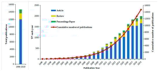 The scientific output from 1996–2019. The number of publications each year is based on the main ordinate axis (the left ordinate), and the cumulative number of publications is based on the secondary axis (right ordinate).