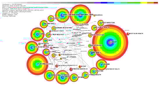 Compared with the number of publications, the frequency of citations to the literature published by a journal can better reflect the influence and importance of the journal. Therefore, this article uses CiteSpace to analyze the quote of the journals, and produced a map of the cited journals, as shown in Figure 3. Based on the frequency of citations, we selectively counted the detailed information of the top 20 journals and drew Table 1. As can be seen in Figure 3 and Table 1, after careful consideration of citation frequency, impact factor, centrality, and H-index, the top five core journals are LANCET (IF: 59.10, H-index: 700), NEW ENGL J MED (IF: 70.67, H-index: 933), JAMA-J AM MED ASSOC (IF: 51.27, H-index: 622), SCIENCE (IF: 41.03, H-index: 1058) and NATURE (IF: 43.07, H-index: 1096). In Figure 3, the nodes of LANCET, NEW ENGL J MED, JAMA-J AM MED ASSOC, SCIENCE, NATURE, and P NATL ACAD SCI USA have relatively large node circles, and there are cool-tone areas in the node circles. However, node circles such as PLOS ONE, BMC PUBLIC HEALTH, LANCET INFECT DIS, and LANCET GLOBAL HEALTH are mostly warm colors. It shows that the critical early literature on global health research mainly came from the journals of LANCET, NEW ENGL J MED, JAMA-J AM MED ASSOC, SCIENCE, NATURE, and P NATL ACAD SCI USA. It is worth noting that the top five journals in the global health field are from the United States (NEW ENGL J MED, JAMA-J AM MED ASSOC, SCIENCE ) and the United Kingdom(LANCET, NATURE).