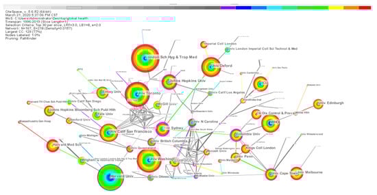 Combined with Figure 5, the top 20 institutions with published papers are listed in Table 3. The London Sch Hyg and Trop Med (433 articles, Harvard Univ (409 articles), Univ Toronto (396 articles), Univ Washington (385 articles), and Univ Oxford (327 articles). All of them made central contributions to the research on global health. It is worth noting that 12 of the top 20 institutions are from the USA, with 11 schools and one government agency. The second is the UK, with three institutions (London Sch Hyg and Trop Med, Univ Oxford, and UCL) in the top 20. It further demonstrates the outstanding contributions and leadership role of the USA and the UK in the field of global health research.