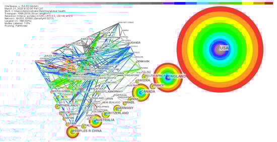 The remaining top five are the ENGLAND (2635 articles, 16.1%), CANADA (1504 articles, 10.2%), AUSTRALIA (1108 articles, 7.5%), and PEOPLES R CHINA (1086 articles, 7.3%). From Figure 6, the center of the circle of this node in PEOPLES R CHINA is mainly a warm tone, while the center of the circle of the node of the USA and ENGLAND has a cold tone. It shows that China, as a developing country, started research in the global health field later than developed countries such as the United States. Besides, although there are already 1086 articles published in China, among the top 20 authors and institutions, there are no authors and institutions from China. It indicates that although China started late in the global health field, it has developed rapidly.