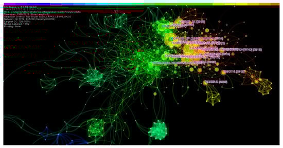 Usually, scholars cite the research results of their predecessors in their papers and list them in the form of references. Mutual citations of scientific literature reflect the objective laws of scientific development [38]. In Figure 7, the early citation network is relatively sparse, and the middle and late citation networks are denser. At the same time, it can be seen from the location of some large nodes that highly cited documents also appear in the middle and late periods.