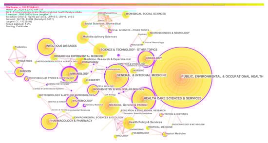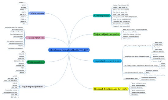 Co-occurrence analysis of subject categories allows us to intuitively understand the main subjects involved in a research field [48]. The classification of the categories in this study comes from the WOS database. In Figure 9, the purple circle on the edge of the node circle indicates that this node has a high intermediate centrality value. In Table 8, we list the top ten subject categories with co-occurrence frequency. Based on Figure 9 and Table 8, the subject categories of global health research are mainly “Public, Environmental and Occupational Health”, “General and Internal Medicine”, “Health Care Sciences and Services”, “Medicine, General and internal” and “Infectious Diseases”. It shows that global health research involves multiple disciplines and fields. Based on the analysis of the previous sections, we have drawn a comprehensive knowledge map of global health research, as shown in Figure 10.