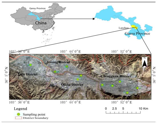 Lanzhou is located at the Yellow River Valley and surrounded by hills. In the south there are Gaolan mountain and other loess hills, with an altitude of 1700~2500 m, which are 180~1000 m higher than that of Lanzhou City; in the north there are Loess hills and low or middle mountains, with an altitude of about 1700 m, which are about 180 m higher than that of Lanzhou City. The landform of the main urban area of Lanzhou City is erosion accumulation valley plain. The geological structure of Lanzhou City belongs to the middle uplift zone of Qilian in Kunlun-Qinling geosyncline fold system. Because the Yellow River runs through Lanzhou City, local groundwater is relatively rich. The groundwater in Lanzhou City is mainly loose rock pore phreatic water. Landslides, collapses, and debris flows are the main types of geological disasters in Lanzhou City. The average annual temperature is 10.3 °C. The annual average sunshine hours are 2446, the frost-free period is 180 days, and the average annual precipitation is 327 mm, which mainly concentrate from June to September. It is an important industrial base and transportation hub in northwest China. The main urban areas of Lanzhou (Chengguan District, Anning District, Qilihe District, and Xigu District, excluding suburban counties) were selected as the research areas. The atmospheric dustfall and topsoil samples were obtained at each sample position. The sampling sites are shown in