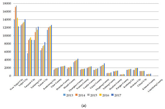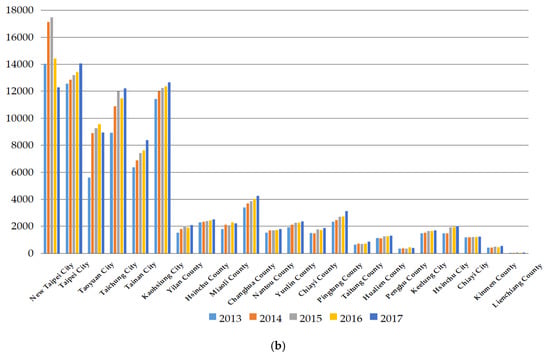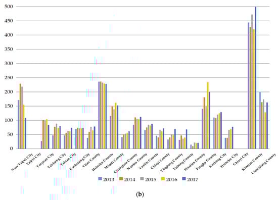 Figure 1b presents the administrative regions with a continuous increase in the carrying capacity of nurses from 2013 to 2017, including Taipei City, Tainan City, and Kaohsiung City, which are three of the top six metropolises in Taiwan. The trend of the carrying capacity of nurses in the other three metropolises is a movement up from 2013 to 2017, excluding New Taipei City, which is a neighbor to Taipei City; the latter is a higher urbanized city than the former. The likely reason that causes a continuously decreasing carrying capacity of medical staff in New Taipei City for 2016 and 2017 offers big potential to increase the number of medical staff and could thus become a strong magnet effect for Taipei City. Aside from them, Hsinchu County, Changhua County, Nantou County, Yunlin County, Pingtung County, Keelung City, and Chiayi City also exhibit a continuous increase in the carrying capacity of nurses from 2013 to 2017, and the percentage of administrative regions with a continuous increase in the carrying capacity of nurses among all 22 administrative regions in Taiwan is 45%.