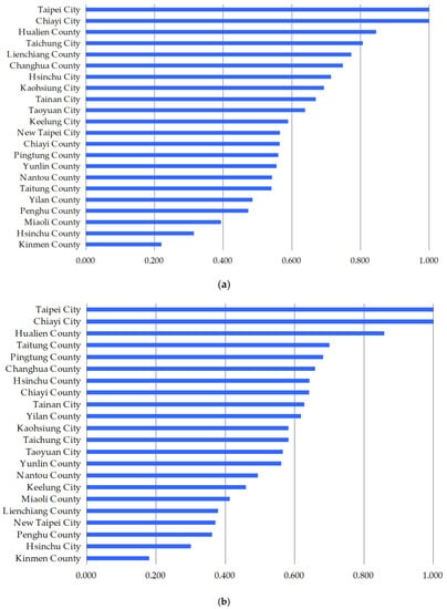 (a) Average carrying efficiency of physicians for administrative regions in Taiwan; (b) Average carrying efficiency of nurses for administrative regions in Taiwan.