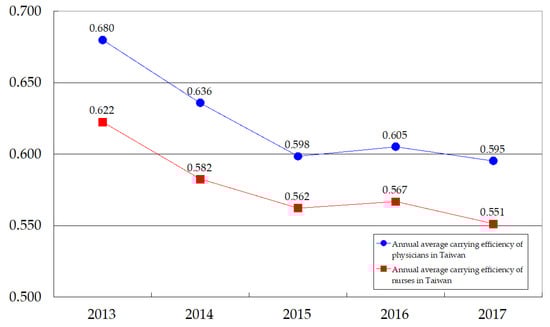 This section assesses and discusses the relative issues concerning the carrying capacity of medical staff in Taiwan under the output-oriented SBM model. The benefit of using the SBM model is that it can treat the case with multiple input and output factors in which two outputs, the numbers of physicians and nurses, were the focus in this study.
