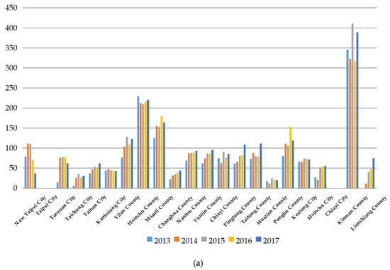 The data used in this study were collected from the National Statistics, R.O.C (Taiwan). The DMUs are 22 administrative regions in Taiwan, including New Taipei City, Taipei City, Taoyuan City, Taichung City, Tainan City, Kaohsiung City, Yilan County, Hsinchu County, Miaoli County, Changhua County, Nantou County, Yunlin County, Chiayi County, Pingtung County, Taitung County, Hualien County, Penghu County, Keelung City, Hsinchu City, Chiayi City, Kinmen County, and Lienchiang County. The data period was from 2013 to 2017. We referred to past literature, such as Wharrad and Robinson [] and Sloan and Hsieh [], to employ three kinds of inputs, including regional population (x1), regional income (x2), and local government expenditure on healthcare (x3), and used the research target to choose two kinds of outputs, including the number of physicians (y1), and the number of nurses (y2). The definition of the regional population is the number of registered permanent residents in an administrative region. Regional income is a multiplier of personal regular income and the number of registered permanent residents in an administrative region. The definition of local government expenditure on healthcare is the final amount for local government expenditures on environmental sanitation, public health and sanitation checks, epidemic prevention and control, and so on. The number of physicians is their quantity supplied, including Western medicine, Chinese medicine, and dentists in an administrative region, and the number of nurses is their quantity supplied, including registered nurses and registered professional nurses in an administrative region. In respect of the five variables, the local government can use inputs to create outputs. The first two inputs are indirect factors that need intermediate factors, such as the local government providing good housing and working environments to affect the regional population and income and then to absorb the medical staff and increase their carrying capacity, and the final input is a direct factor relative to the social welfare expenditure on healthcare to directly absorb medical staff and to directly increase their carrying capacity. This study applied the SBM model on the panel data of 22 DMUs that spanned the time path from 2013 to 2017. All monetary data were transformed into real data by using a GDP deflator, with 2011 as the base year.
