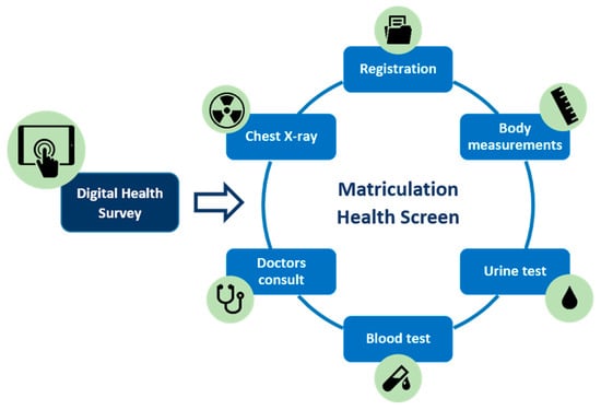 Universities utilise health screening to determine the minimum physical health requirement for incoming students, and to ensure the safety and wellness of the school population. Universities are particularly at risk for communicable disease outbreaks, because of the diversity of geographical origins, high degree of person-to-person interaction, and relatively crowded dormitory settings []. Requirements for entry into the university or designated courses vary by institution and can, for example, include proof of vaccination or other medical investigations, e.g., blood test or chest X-ray (CXR).