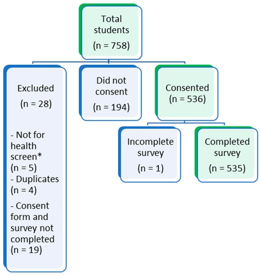 Flow diagram showing exclusion of study participants. (* students who attended clinic for other health related matters).