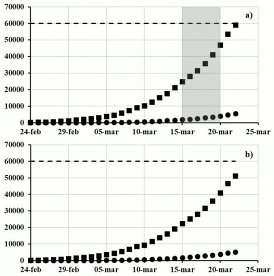 Despite the imposition of these security measures, the number of infected people and deaths continued to grow. Specifically, Figure 1a shows the numbers of infected people and deaths with SARS-CoV-2 daily communicated by the Italian Civil Protection Department. These official data are very important since their update was communicated every day at 6:00 pm by the main media (social media and television). In particular, the number of infected people was lower than 0.1% of Italian inhabitants until 20 March 2020 (see the dashed line in Figure 1) and the lethality, expressed as the ratio between the deaths and the infected people, was in the range of 7.3–8.3%.