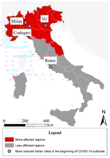 On 23 January 2020, a couple of Chinese tourists arrived in Milan from where they had moved for a tour in the Italian provinces before arriving in Rome. Unfortunately, on 30 January 2020, they showed relevant symptoms of COVID-19 and were admitted to the “Lazzaro Spallanzani” National Institute for Infectious Diseases (Rome), where the positivity for SARS-CoV-2 was confirmed. This represents the first case of SARS-CoV-2 transmission described in Italy and prompted the Italian Government to declare the state of emergency []. During the same day, the WHO declared this outbreak a Public Health Emergency of International Concern (PHEIC).