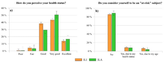 As far as the assessment of the perceived health status of each responder is concerned (Figure 3a), most of them reported that they have a good (ILI 38.19%, ILA 29.23%), very good (ILI 43.38%, ILA 50.58%), or excellent (ILI 13.74%, ILA 16.47%) health status. Instead, a smaller percentage of the sample stated a poor (ILI 4.16%, ILA 3.25%) and a fair (ILI 0.53%, ILA 0.46%) health status. Further, more than 80% of ILI and ILA believes to be not at-risk of SARS-CoV-2 infection (Figure 3b).