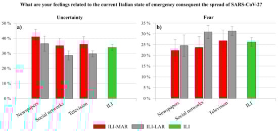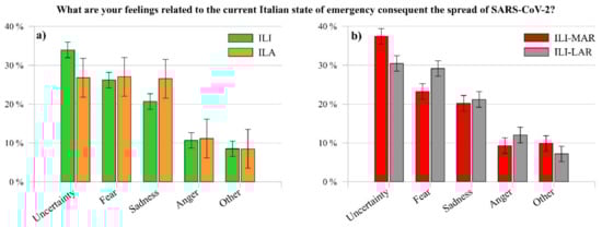 Although Figure 4a shows that the prevailing feeling among ILI is uncertainty, Figure 4b reports a notable difference between the same feeling experienced by ILI-MAR (37.43%) and ILI-LAR (30.46%). Probably, the former negative effects of mitigation measures on the production system (e.g., closed factories, suspended or cancelled orders and layoffs) might have generated a higher uncertainty feeling in ILI-MAR. As the matter of fact, they live and work in the regions with the higher Italian GDP (Gross Domestic Product), corresponding to the 58% of the Italian GDP []. Indeed, in line with this consideration, a recent study conducted in the USA reported that the economic uncertainty induced by the spread of the virus could reflect a general feeling of uncertainty in the population [].