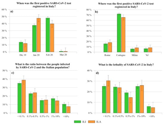 Comparison between the level of knowledge of ILI and ILA about the date of the first positive SARS-CoV-2 test registered in (a) Italy, (b) the place where it was registered, (c) the ratio between the number of people infected by SARS-CoV-2 and the Italian population, and (d) its lethality in Italy.