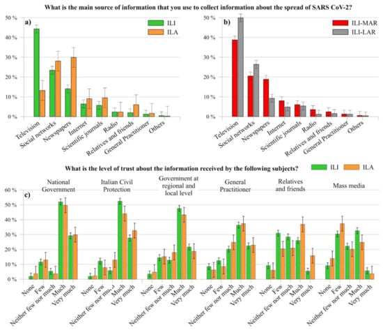 Comparison among ILI and ILA (a), and among ILI-MAR and ILI-LAR (b), as regard to their main source of information about the spread of SARS-CoV-2; comparison among ILI and ILA (c) as regard to their level of trust of the information received by the above-cited subjects.