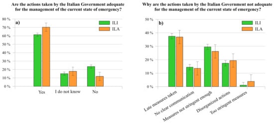 Figure 7a shows the results associated to the question “Are the actions taken by the Italian Government adequate for the management of the current state of emergency?”. In general, despite their severity, both ILI and ILA expressed a positive feeling related to them (ILI 61.41%, ILA 70.30%). As regard to those who highlighted the inadequacy of the adopted mitigation measures (23.55% ILI and 11.83% ILA), Figure 7b reports the reasons of their negative evaluation. Specifically, around 37% of both clusters stated that actions were applied belatedly, whereas 29.53% of ILI and 26.21% of ILA affirmed that they were not enough stringent. Moreover, less than 20% of respondents defined the measures disorganized, highlighting a lack of clear communication (around 14% of both ILI and ILA).