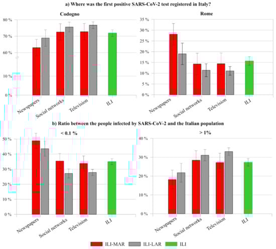 Cross data comparison between ILI-MAR and ILI-LAR related to their level of knowledge about (a) the place of the first positive SARS-CoV-2 test in Italy, and (b) the ratio between people infected by SARS-CoV-2 and the Italian population, according to the main source of information of respondents.