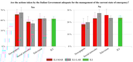 Finally, only a negligible part of them (ILI 1.11%, ILA 3.88%) considered the adopted measures too stringent. Thus, the findings indicate a widespread acceptance of the government measures by the interviewees, even though they limit the freedom of movement and interaction of individuals and, therefore, lead to a full and sudden change in daily lives routine. This can also be related to the high level of confidence about information received from these institutions, as already highlighted in the previous paragraph. Specifically, as previously reported [], severe and strict security measures are more likely to be accepted in a situation of shared uncertainty and fear (see Figure 4).