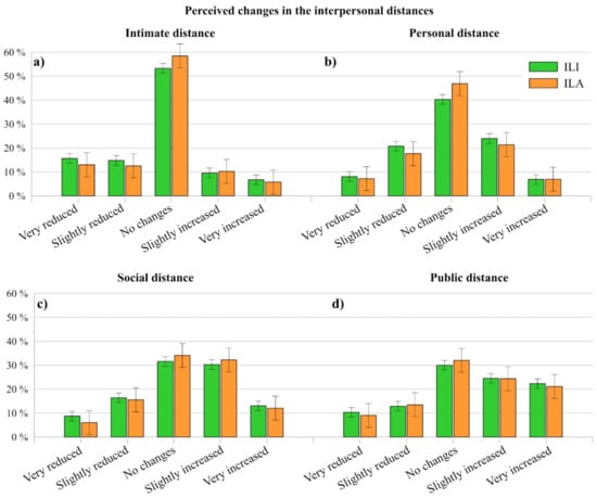 Since social distancing is the first defense against the spread of COVID-19 outbreak, one of the aspects investigated in this work is the foresee variation of interpersonal distances after the end of the Italian state of emergency. To the question “In your opinion, at the end of the state of emergency issued by the Italian Government, what will the following interpersonal distances be like?”, respondents generally expect some changes in the future interpersonal distances (intimate, personal, social and public). Moreover, the general trend does not show consistent differences between ILI and ILA perceptions.