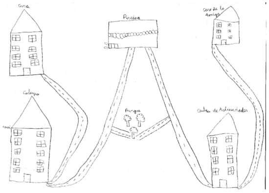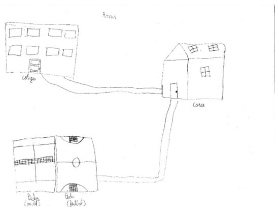 From Monday to Friday, the students in urban environments barely had any leisure time and opportunities for spontaneous leisure activities, with these being limited to watching TV or playing videogames. As children started in higher grades, the number and complexity of school tasks also increased, which forced them to give up some of the scheduled activities, especially sports. Therefore, the time dedicated to physical activity and leisure games was reduced. Moreover, the scant offer of extra activities in rural areas limited the participation of children in sport activities, and so they spent more time in the park. The park was a common subject in both urban and rural children’s drawing (e.g., Figure 2 and Figure 3), despite the former reporting they could not go to the park during their leisure time because they had too many scheduled activities.