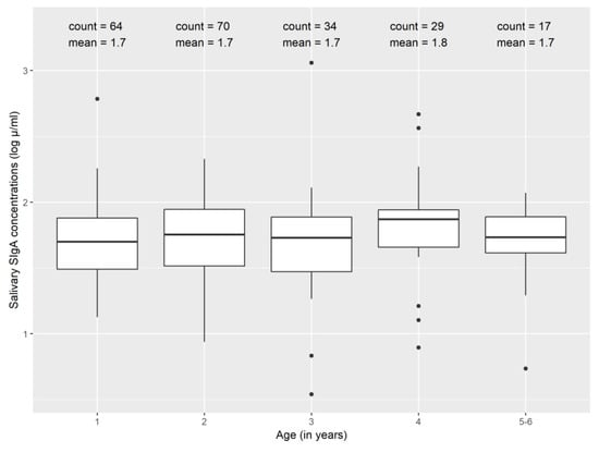 - Lim, P.W.; Nambiar, S.; Muhardi, L.; Abdul Kader, U.H.; Garssen, J.; Sandalova, E. Young Children Display Diurnal Patterns of Salivary IgA and Alpha-Amylase Expression Which Are Independent of Food Intake and Demographic Factors. BioMed Res. Int. 2019, 2019, 3687416. [Google Scholar] [CrossRef] [PubMed]