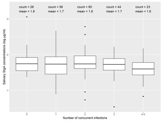 | Salivary SIgA levels in μg/mL—Median (IQR) | 54 (34, 85) |