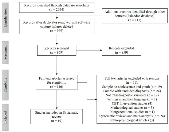 We obtained data from the 110 full-text articles included after review by the first investigator (RT) and verification by the two jurors (JG and then FZ). Once the scores were reviewed in agreement, the data was extracted with the final full-text articles (n = 19, 17.27%, of n = 110, 100%). Which went on to the systematic review in which the authors, countries, sample(s), ages, sexes, AD evaluated, measurement instruments, the transdiagnostic variables identified, and the main findings were extracted.