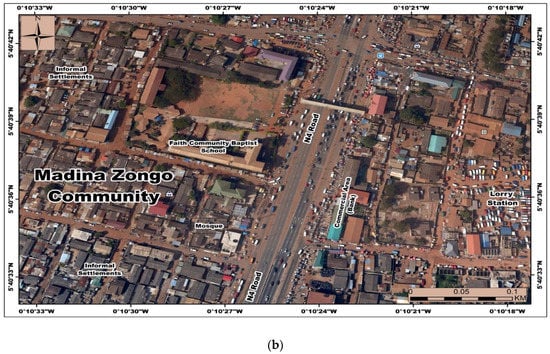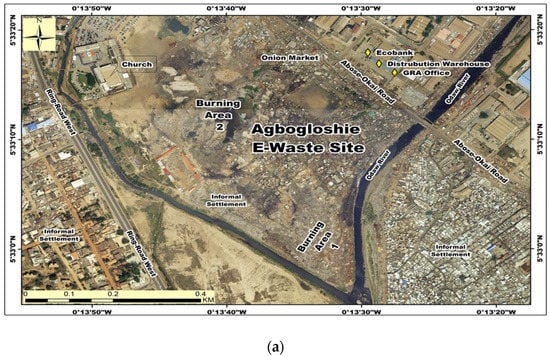 Google earth map views of study sites, Agbogbloshie and Madina-Zongo, Accra-Ghana. (a) e-waste recycling (exposed site); (b) Madina- Zongo (Control site).