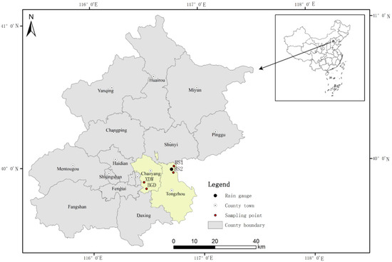 The examined areas located in Tongzhou District and Chaoyang District covered 37.09 and 46.42 ha, respectively, and the impervious area fractions were 32.5% and 67.8%, respectively. This is an important diplomatic and commercial area of Beijing and a sub-central area of the city under vigorous construction. The average annual rainfall in Beijing is 585 mm, and most of the rainfall occurs in April to October, accounting for more than 85% of the total annual rainfall.
