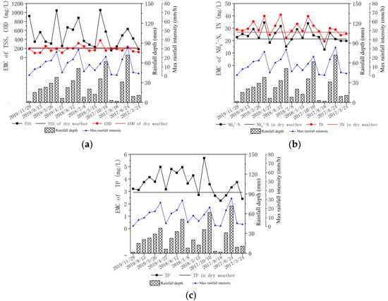 Rainfall depth, max rainfall intensity, and event mean concentration (EMC) of primary pollutants in 21 storm events. The horizontal line represents the dry weather concentration of the corresponding pollutant. (a): The EMC of total suspended solids (TSS) and chemical oxygen demand (COD); (b): The EMC of NH4+-N and total nitrogen (TN); (c): The EMC of total phosphorus (TP).