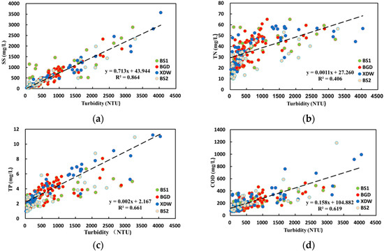The linear fit relations of primary pollutants and turbidity at the four sampling points of combined sewer sewage in the southeast area of Beijing. (a): The linear fit relations of SS and turbidity; (b): The linear fit relations of TN and turbidity; (c): The linear fit relations of TP and turbidity; (d): The linear fit relations of COD and turbidity.