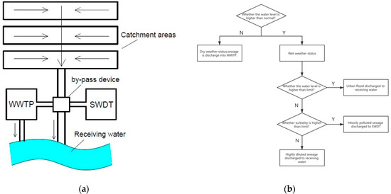 The ultimate goal of CSO control is to make the function of the receiving water body reach the standard. Therefore, no matter what water quality parameter is selected as the control standard, it is necessary to use the actual water quality as the goal, the overflow water quantity control of CSO in the basin as the means, and then finally determine the standard value and corresponding control scheme by comprehensively considering the cost and effect. Assuming that a certain river basin uses TSS as the control water quality parameter, the standard limit of TSS is set to 100 mg/L, and the regression equation in Section 3.3 is substituted, corresponding to a turbidity value of 78 NTU. When the turbidity of sewage in the combined sewer in wet weather is greater than 78 NTU, the sewage is considered to be seriously polluted and needs to be stored and treated. A liquid level meter and a turbidity sensor must be used together to judge the three states of dry weather, wet weather, and flood discharge to prevent domestic sewage with high turbidity from being discharged into the detention tank during dry weather. In addition, when the water level is higher than the limit, in order to prevent urban flooding, the inflowing water will be discharged into the river, even if the turbidity value exceeds the threshold. The identification equipment can be installed in the by-pass device, and the process flow chart is shown in Figure 4.