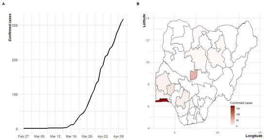 Between 27 February 2020, and 11 April 2020 (a 45-day period), a total of 318 confirmed cases and ten COVID-19 deaths (case fatality rate of 3.14%) were recorded in Nigeria. Figure 1 presents the cumulative number of confirmed cases over time and the geographical coverage of the disease. The temporal trend of the incidence showed an exponential growth. The first case of COVID-19 occurred in Lagos state, the economic hub of the country, which has remained the focus of the pandemic in Nigeria. About 72% of the cases were reported from the duo of Lagos and the Federal Capital Territory (FCT). More than 47% of the cases are imported cases (travel-related) and the spread of the disease has been concentrated in the southern region of the country and the FCT (Figure 1, Figure A1 and Figure A2).