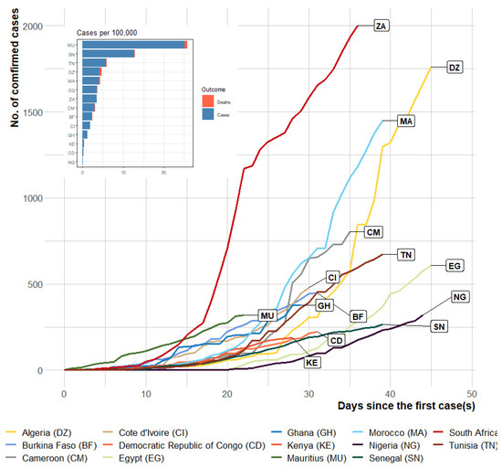 The number of confirmed cases in the first 45 days of COVID-19 importation to selected African countries. Inset: cases per 100,000 population as of 11 April 2020.